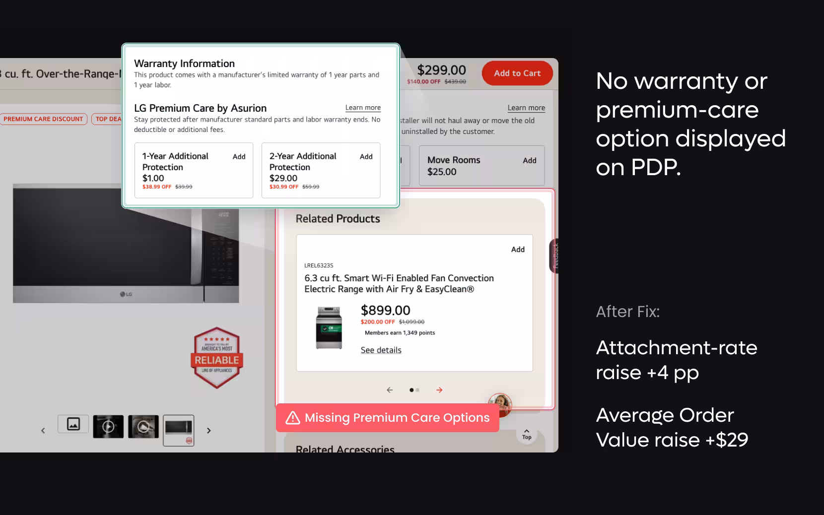 - Missing warranty & add-on blocks – premium-care and upsell widgets disappeared from PDPs, cutting attachment-rate and average order value.