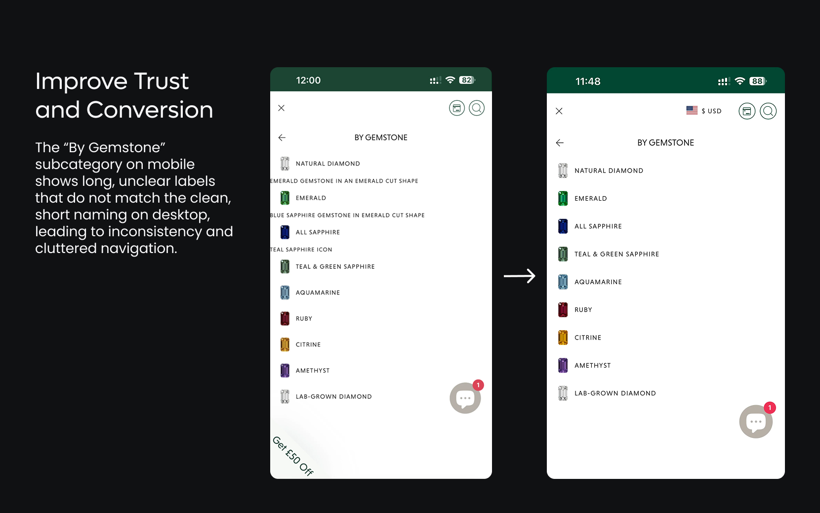 The “By Gemstone” subcategory on mobile shows long, unclear labels that do not match the clean, short naming on desktop, leading to inconsistency and cluttered navigation