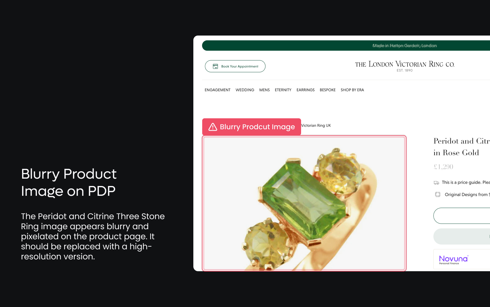 The Peridot and Citrine Three Stone Ring image appears blurry and pixelated on the product page. It should be replaced with a high-resolution version.